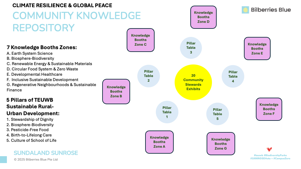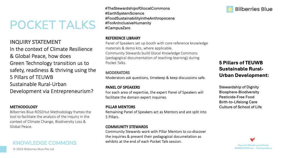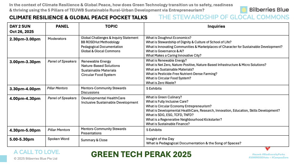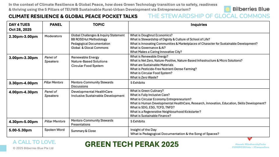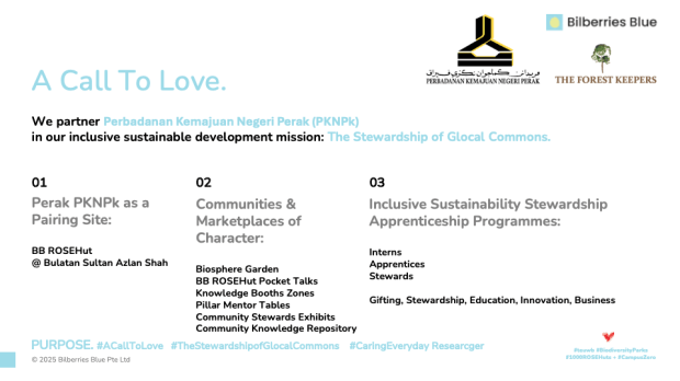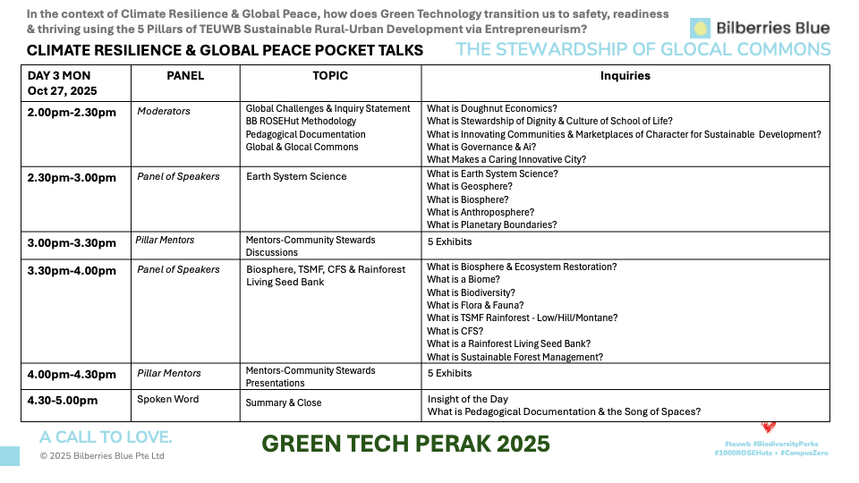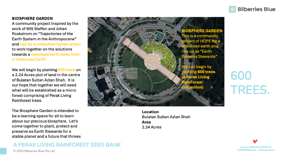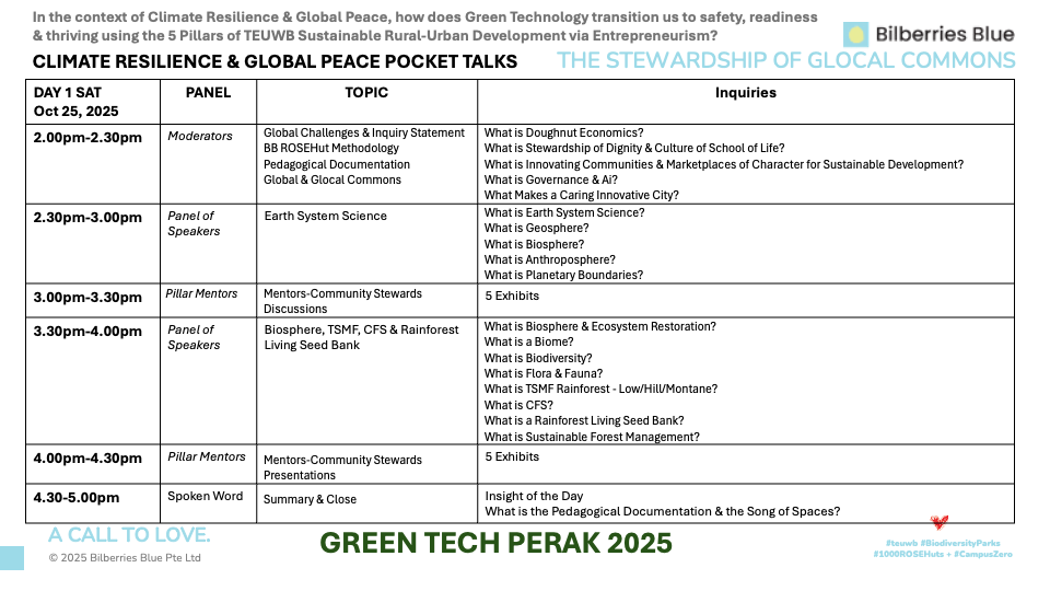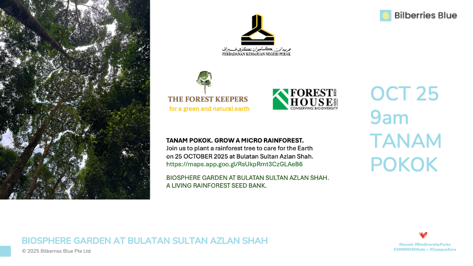 Bilberries Blue and its associated companies – The Forest Keepers, Food Forest Farm, Moonriver Lodge, One Love, Sigar Highlands Sustainable Development Centre) – are co-curators at Green Tech Perak 2025 from Oct 25-28, 2025 for two conference sessions: Biosphere Garden at Bulatan Sultan Azlan Shah and BB ROSEHut Pocket Talks on Climate Resilience & Global Peace.