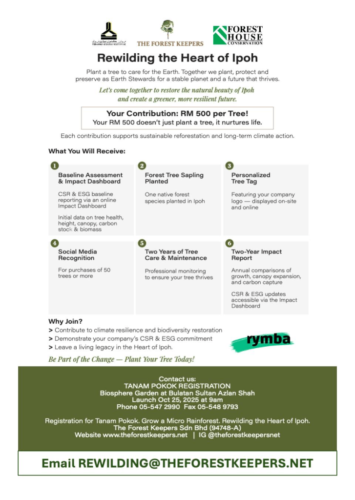 In partnership with Perbadanan Kemajuan Negeri Perak (PKNPk), The Forest Keepers and Forest House Conservation, join this effort to rewild the Heart of Ipoh through urban forestry.