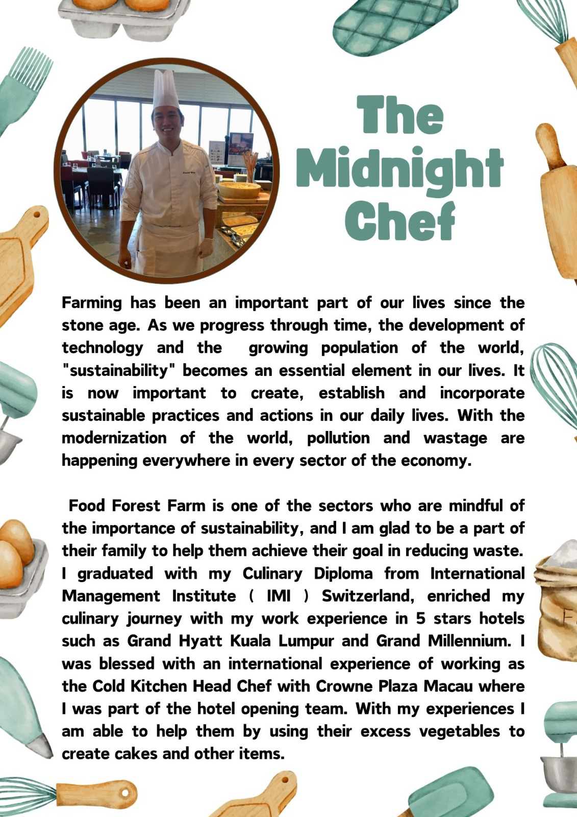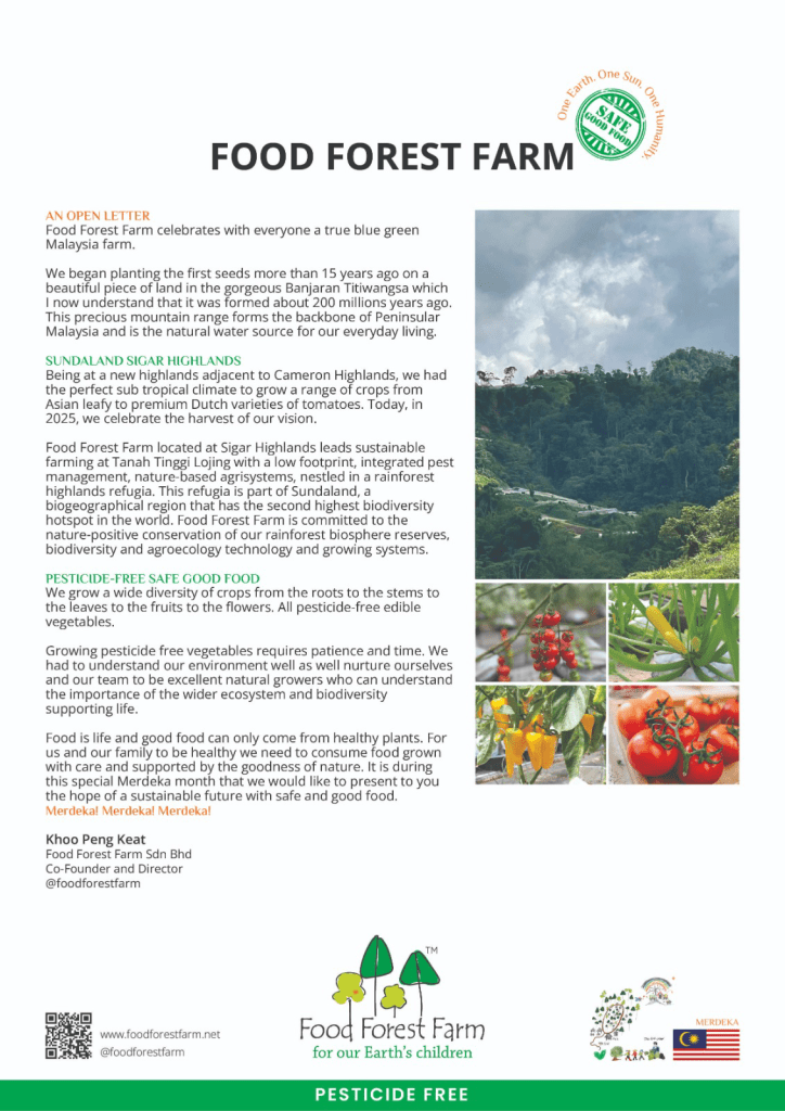 In 2012, he co-founded Food Forest Farm Sdn Bhd located in the southern hills of Sigar Highlands with an ambitious vision to steward an integrated approach to grow good and safe food using sustainable practises in symbiosis with biodiversity. Over the years through combining traditional farming practices, growing technologies and deep knowledge of local ecosystem and plant physiology the farm has grown to be the biggest certified pesticide-free farm in the highlands of Peninsular Malaysia. He continues to explore solutions for the future of food in areas such as plant nutrition, energy generation using solar and micro-hydro technology, sustainable food processing, composting to move to zero waste from linear to circular business. The core principle of his work essentially starts with a culture of kindness which then translates to action with love and care, coupled with a resilient attitude to continuously be successful in growing vegetables high in nutrition in a climate which is becoming very unpredictable.