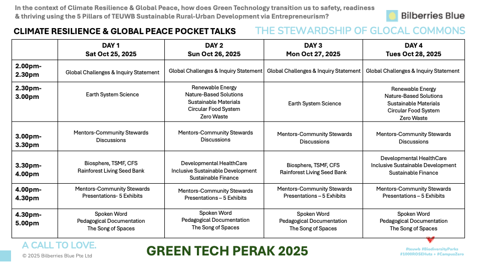 Bilberries Blue and its associated companies – The Forest Keepers, Food Forest Farm, Moonriver Lodge, One Love, Sigar Highlands Sustainable Development Centre) – are co-curators at Green Tech Perak 2025 from Oct 25-28, 2025 for two conference sessions: Biosphere Garden at Bulatan Sultan Azlan Shah and BB ROSEHut Pocket Talks on Climate Resilience & Global Peace.