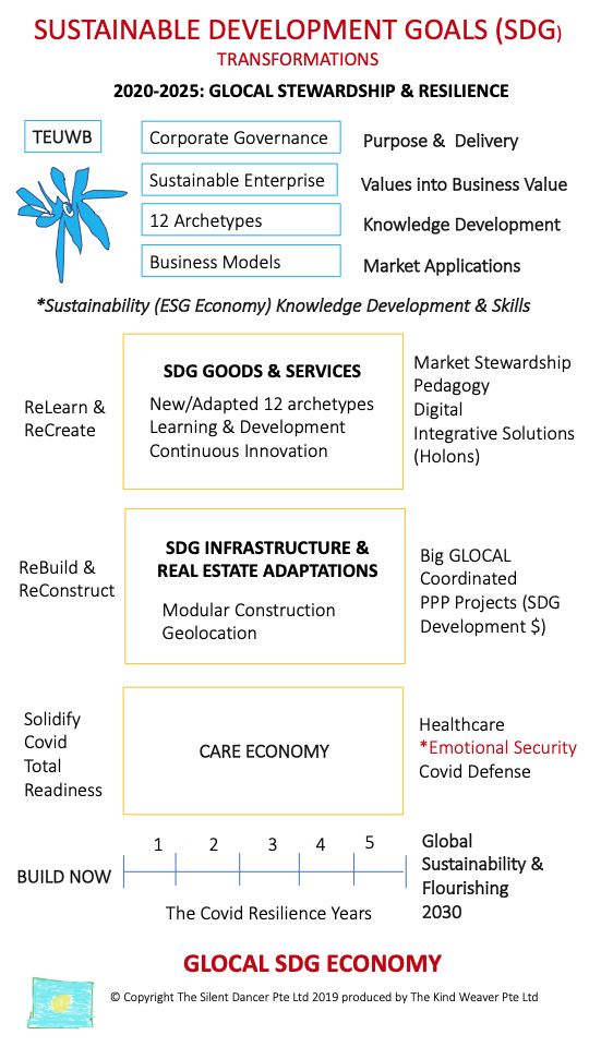TEUWB again offers an enhanced approach to globalisation – countries should now reorientate their efforts and develop a “Glocal” SDG Economy. It is unthinkable to ignore the globalisation process and events happening worldwide. Instead, development efforts in any local economy must necessarily fuse and synthesize the ‘global’ and the ‘local’, hence “Glocal”. An effective and well-run “glocal” SDG economy can only fully realise its objectives when it has successfully taken into consideration both the globalisation process and the local context (economic structure, operating and regulatory environment, political and socioeconomic developments, just to name a few).